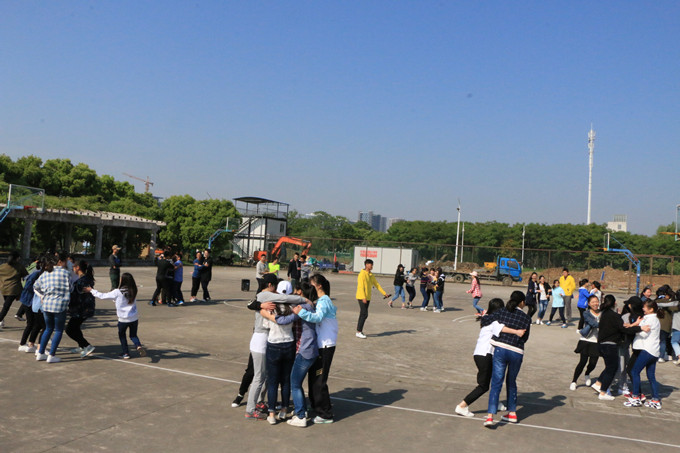 本次活动主要为桃花朵朵开、太空漫步、穿越电网等三个模块。在经过短暂的面对面握手游戏的热身后,大家迅速融入训练的氛围中。紧接着,60余名同学围成一个大圈进入“桃花朵朵开”环节,这项紧张的喊数抱团游戏竭力要求大家抓住机遇,考验了同学们的反应能力和团队协作能力。而将跳钢管舞作为游戏失败的惩罚更是笑料不断。随后,主教练张老师将同学们随机分为4个小组,进行小组风采展示,一个个诙谐有趣的队名、队歌、队训引发场下阵阵的欢笑和掌声。此环节不仅拉近了各小组成员的距离,还激发了同学们的创新思维。