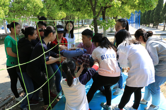 接着,正式开启拓展训练模式,各小组在各带队教练的组织下分别开展太空漫步和穿越电网两个版块。太空漫步环节中各小组同学靠着一根绳子给予信任并且收获信任,每个在拉起紧绷的绳子上走过一圈的人都颇有感触,信任总是相互的,一切看似不可能的任务在大家的共同努力之下都可以轻松完成。而穿越电网则是通过全队同学的配合,在不接触“电网”的前提下,必须全员穿越各大小不一的网孔,否则任务失败,此项游戏越发考验一个团队的力量。合理分工,相互配合无疑是至关重要的。经过一系列的训练活动,大家在疲惫中感受快乐,在信任中增进感情,在失败中收获成长,而这一举必将成为同学们大学四年永恒难忘的回忆。