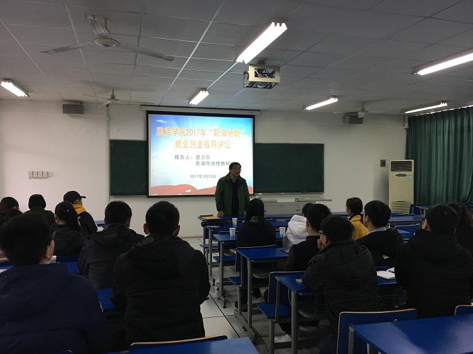 2017年“职海扬帆”就业创业指导讲坛暨芜湖市第七中学地理教师校长实名制推荐招聘会在院实验楼202教室举行。芜湖市地理教研员裘卫东,芜湖市第十一中学地理教师马辉陵,芜湖市第七中学教师吴国春参会并作为评委,论坛由女同做爱
