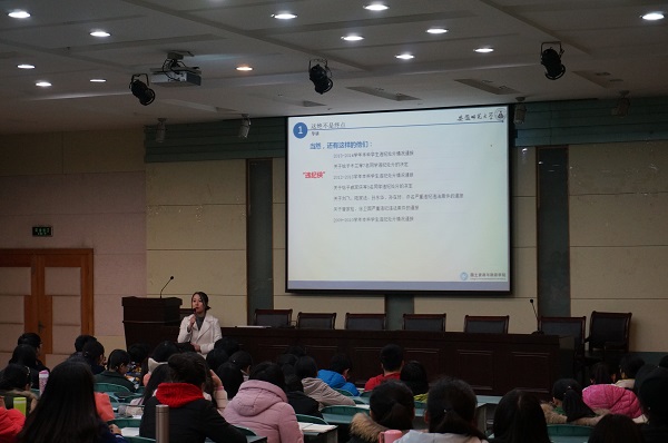 班会伊始,刘冠琪老师向同学们介绍了2012级优秀学姐盛婷同学的大学故事,从大小奖项荣誉到实际生活,从师范技能、志愿服务、爱心支教、组织策划各个方面和我们分享榜样的力量。接着刘冠琪老师以可爱滑稽的图片同学们分享了“低头族”、“手机控”、“觉觉党”,以幽默风趣的话语提醒我们时间管理的重要性,同学们听地十分认真,班会的气氛也轻松活跃起来。