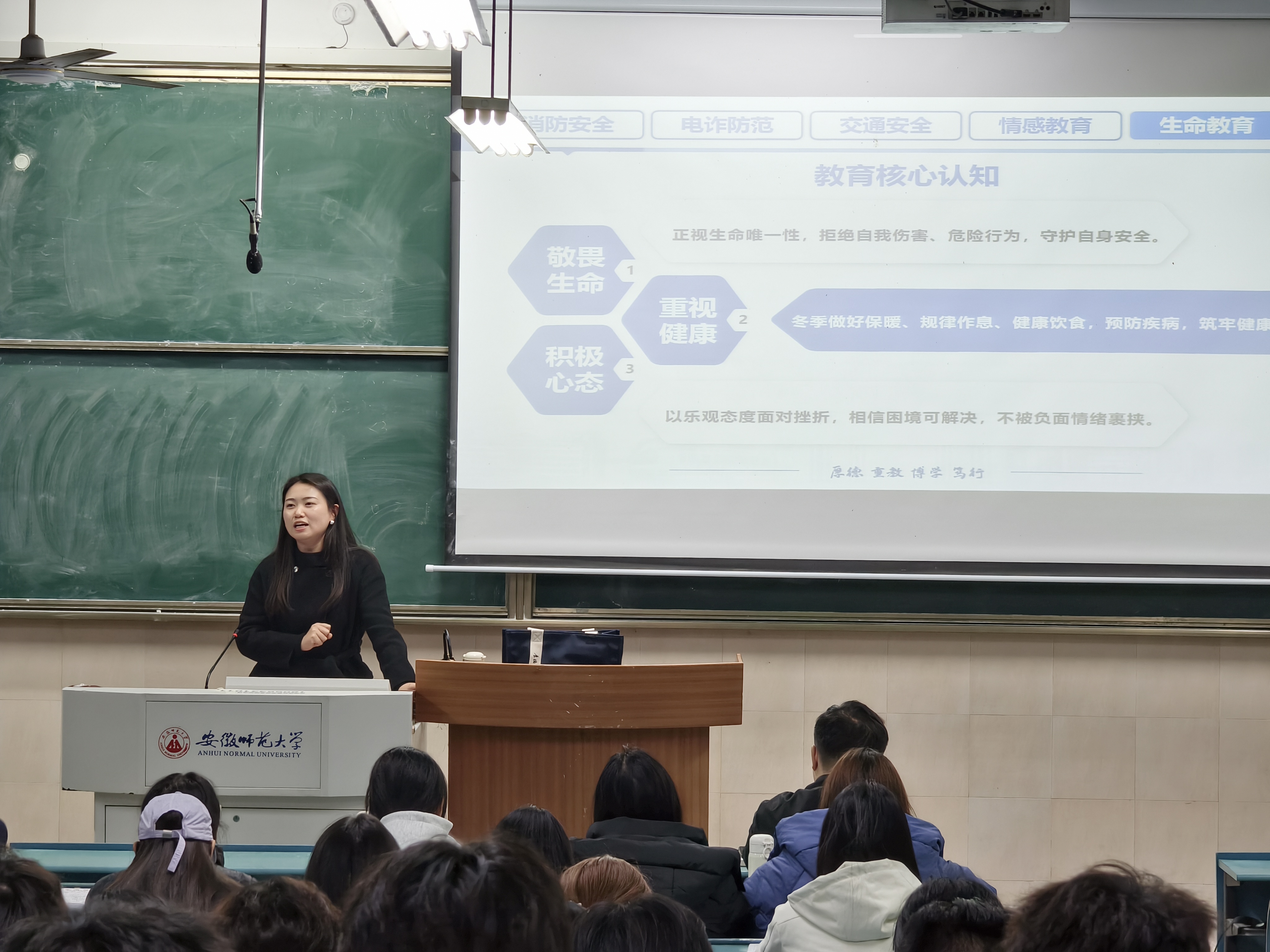 吴文涵首先聚焦“冬季校园安全”这一核心主题,结合近期气候特点与校园生活实际,进行了全面细致的警示教育:一是消防安全,详细讲解了宿舍、教室等场所的用电规范,严禁使用违规电器,并科普了火灾逃生自救知识;二是交通安全,针对冬季雨雪等恶劣天气增多的情况,提醒学生出行遵守交通规则,注意防滑防摔;三是人身与财产安全,警示学生警惕各类诈骗手段,妥善保管个人财物,提高自我保护能力;四是健康安全,提醒学生注意防寒保暖,保持宿舍通风,预防冬季流行性疾病,保持规律作息和适度锻炼。