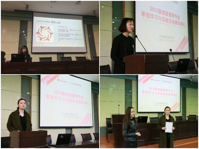 颁奖典礼在全体同学的热烈掌声中拉开帷幕,主持人按照“旅游直播形象大使”、“阅读达人”、“先锋青年”、“体育达人”“最佳团小组”五个类别依次揭晓获奖名单, 接下来,获得先进个人的学生代表依次上台发言,发言的内容主要是分享介绍寒假期间自己的经历体验,以及所行所为所思所想。“旅游直播形象大使”说旅游+互联网思维是大势所趋,身为旅游管理专业学生,应该多涉猎相关知识,增强实践能力。“体育达人”告诉我们跑步其实很简单,你需要的只是一双跑鞋和一颗热爱运动的心;“读书达人”告诉我们看书或旅行,心和身体总要有一个在路上;“社会实践达人”告诉我们有人的地方就有社会,你无法改变这个世界,却可以从点滴开始改变自己。旅游管理二班第四团小组组长侯颖上台领奖时也总结了团小组活动组织的经验。看着获奖同学一一走上领奖台,台下同学从中感受到优秀不是天分而是坚持养成的习惯,默默努力,辛勤耕耘,一份努力一份收获。