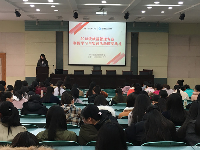 韩静茹)近日,2015级旅游管理专业在国旅实验楼召开青春导航系列主题班会暨“寒假实践活动颁奖典礼”,总结寒假期间全体旅游专业学子的各项学习实践成果,表彰各类活动表现优异的同学们。通过此种典型表彰形式,激励同学在新的学期,追求更优秀的自己,打造更优秀的大学生活。