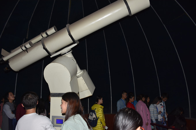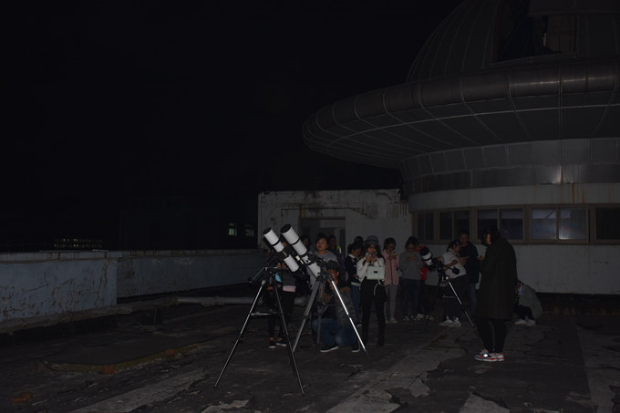 活动前一小时,地理科普协会的理事们就前往天文台进行调试准备工作。晚上7:00,因为天气原因,天空中看不到月亮,但大家都耐心地等待着。直到20时许,乌云逐渐散去,月亮才慢慢出现。工作人员重新调望远镜角度,为了能让更多的同学欣赏这一天文奇观,地理科普协会又搬出了四架型号不同的小型望远镜放在天台上,让同学们轮流依次有序使用天文望远镜进行观测。现场同学们兴趣浓厚,气氛热烈。