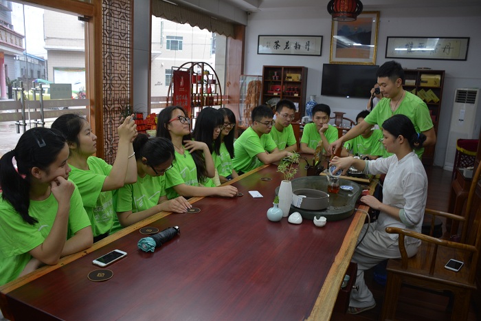 淡淡茶香,红红丹霞。紫沙壶,青瓷杯,茶叶沉底,茶香四溢。在评茶师玲姐的介绍下,队员们品尝了丹霞岩红红茶和秋美人乌龙茶。玲姐的细心讲解,让队员们增长了对茶文化的了解。丹霞的山,丹霞的水,形成了独特的丹霞的茶文化。玲姐向同学们介绍说:“你们考察丹霞地貌,也应该多多了解当地的茶文化,很多时候作为科学研究者也应该具备一定的文化素养。”简单的话语,却引发了同学们的共鸣。晚7点,队员们带着不舍的心情离开了茶馆。