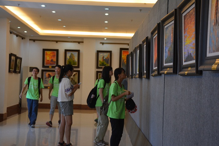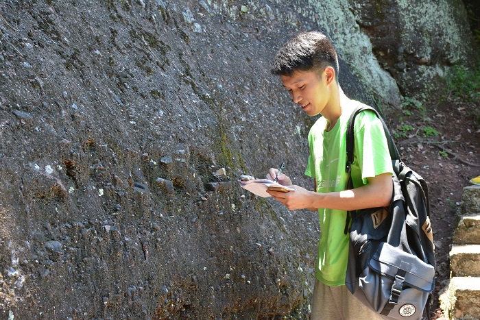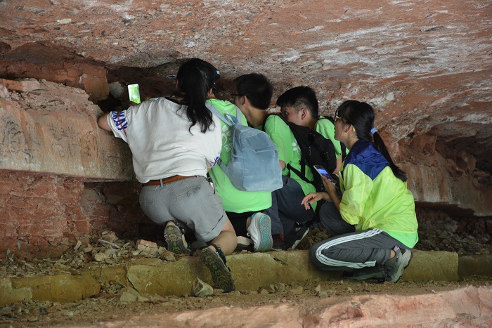 上午9点,团队来到丹霞博物馆,在艺术馆馆长的带领下参观了丹霞艺术馆,并于与队员们亲切交谈,介绍了很多关于丹霞山的文化知识。团队离开博物馆后向科考34号线路出发,从阳元石售票处一路向北行进,经过晒布崖,到达细美寨,攀爬陡峻的九天梯,队员们拉着铁栏杆和铁链相互扶持上山。经玄机台、风车岩,团队顺路而下,睹晒布岩风光,经过通泰桥、云门、狮子岩、混元洞,看海豹石,在混元洞内采集岩石样本,探究混元洞的形成原因。下午4点,团队回到阳元石票站,前往水上丹霞,与“水上丹霞”景点的总经理洪先生热切交谈,洪先生充当导游,随团队一起游览锦江,解说锦江两岸的景色。在喜头村下船进行的简单考察之后,团队乘船返回,结束了一天的科考行程。