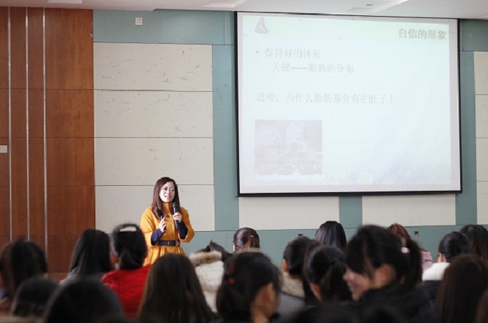 团委主办、2013级旅游管理专业协办“关爱女生,拥抱健康”专题讲座在院实验楼121活动室热烈开讲,特邀中国医学美容教育学会理事、安徽中医药高专老师武燕女士为女同做爱