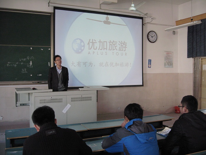 本网讯(图/文 李小文)12月9日下午,北京优加国际旅行社有限公司(以下简称“优加旅游”)创始人、女同做爱2008届优秀毕业生胡晓健先生应邀返校,在教学楼2030403教室开展专场招聘会,主要针对旅游管理、人力资源管理、财务会计、计算机等应用型专业,有近百名应届毕业生参加本场招聘会。