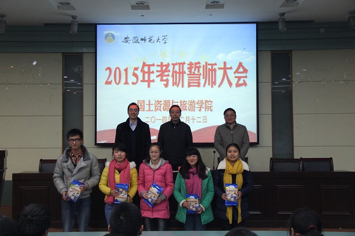 在院实验楼101教室召开2015年考研慰问誓师大会。院长焦华富、副院长苏勤、院党委副书记乔静,毕业班辅导员及2011级备战考研的150余名学生出席了大会,会议由乔静副书记主持。