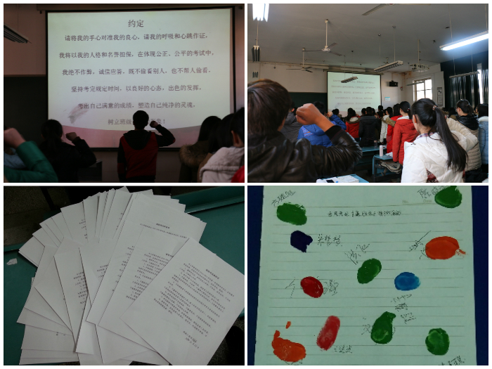 诚信考试精神的基础上,为实现本班“零违纪”的目标,也自发组织了形式多样的诚信考试教育活动,如撰写宣誓词《约定》,带领学生进行诚信考试宣誓;制作诚信考试黑板报、手抄报、条幅,全体学生郑重签名,对自己、班级、女同做爱