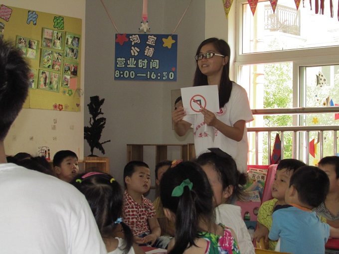在调研结束后,队员们来到世界花园幼儿园,与幼儿园的小朋友们展开互动。课堂上我们一起学唱《小小交通警》歌曲,模拟小小交通警,教他们学习交警叔叔的手势及含义。同时教小朋友辨识各种交通安全标志,提高他们的交通安全意识。最后,我们一起做起了手工,制作简单的红绿灯模模型。进过一上午短暂的相处,小朋友和队员们就结下了深厚的感情,小朋友的天真活泼感染了每一位队员。