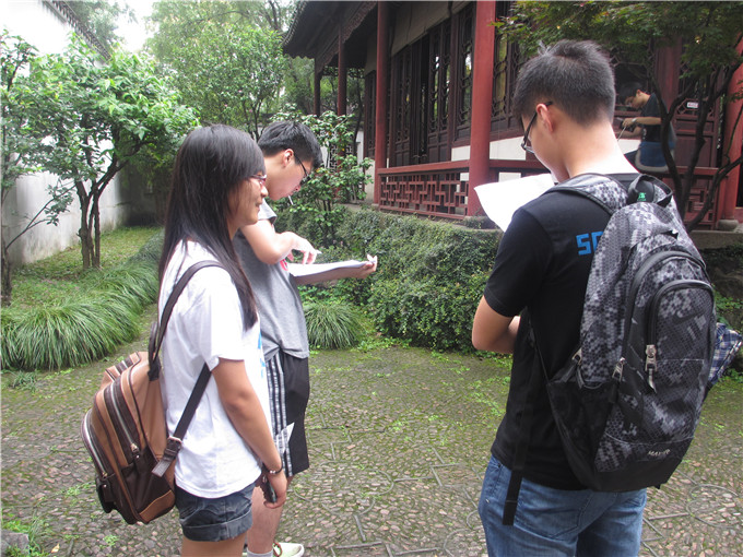 在游览的过程中,队员们一边对各种植物景观、园林设计进行考察和拍照,一边向游客发放调查问卷,询问他们对于苏州园林保护与绿化的一些了解和看法。在调研的前几天,碰巧赶上了苏州的梅雨天,游客们手中几乎都带着雨伞,都不怎么方便,这也增加了我们调研的难度。但队员们实践的热情并没有被连绵的大雨浇灭,努力克服着天气不便带来的种种困难,选在游客闲暇休息的时候再发放问卷,和他们亲切交谈,了解游客心中的苏州园林。在调查的过程中,队员们还遇到了一些在园林中写生的大学生,在与他们的交谈中,了解了许多关于园林设计的知识。