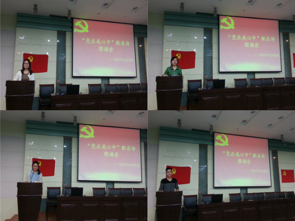 实验楼101教室迎来了一场“党在我心中”配乐诗朗诵会。《我的祖国》、《翻开五月的日历》、《祈祷》……各位学员代表们或激情昂扬或沉重铿锵地将一首首爱国爱党诗演绎得淋漓尽致,引起台下听众的强烈共鸣,纷纷给予雷鸣般的掌声。
