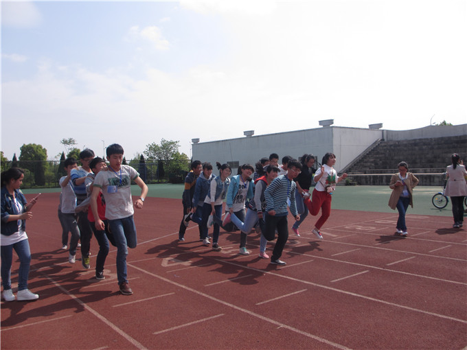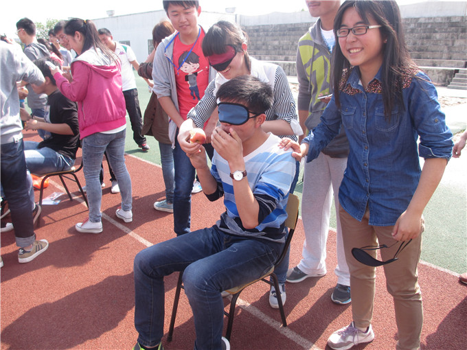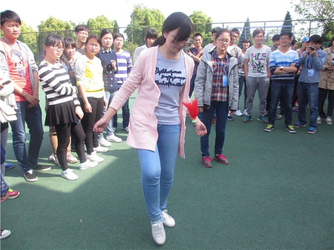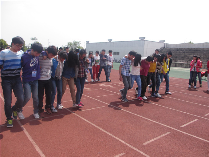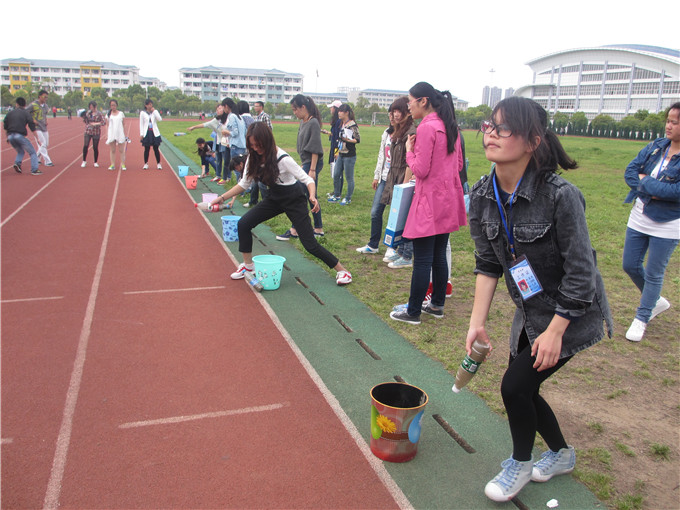 当日,风和日丽、万里无云。下午1点整,学生会工作人员便来到校南体育场上开始积极认真为活动的顺利开招做着精心的准备。此次素质拓展活动以部门为单位,共设置了“两人三足”、“接龙跳”、“踢毽子”、“吃苹果大PK”、“心有灵犀”、“投矿泉水瓶”、“双人顶气球”等七项妙趣横生的游戏项目。