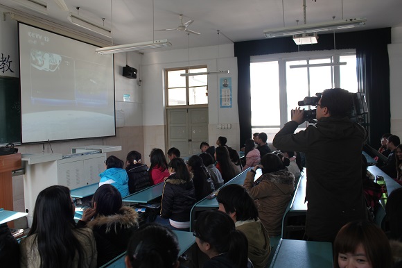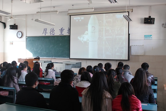 12月2日一早,国旅师生齐聚教学楼2040505教室一起观看了搭载着嫦娥三号的长征三号乙运载火箭点火发射实况转播,更加深入地了解了中国航天事业的伟大进程和重大成果。观看现场,随着“长征三号”发射倒计时的开始,全场师生情不自禁地齐声倒数:“十、九、八……”当“长征三号”傲然升空后,全场沸腾,为祖国加油、喝彩,掌声、欢呼声以及全体师生的航天激情久久激荡在整个现场……收看仪式结束后,同学们激动的心情依然难以平复,在接受安徽卫视的采访时,他们纷纷表示:“嫦娥三号的成功发射凝聚了几代航天人的智慧与心血,标志着中国探月之旅不断开启新的征程,是‘中国梦’与‘航天梦’完美结合。作为当代青年,我们要学好本领,培养科学精神,增强创新能力,为实现伟大壮丽的‘中国梦’而奉献青春。”
