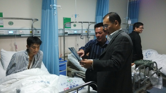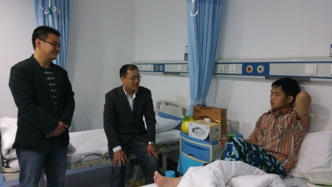10月15日,13级地理科学专业学生姜伟胜因体育测试50米短跑过程中意外摔倒,造成右肩锁骨骨折住院治疗;同专业何广静同学也因水土不服导致内分泌失调,致使下半身浮肿。当晚,院党委副书记罗振、13级辅导员陈健和学生代表,先后来到芜湖市中医院和芜湖市第二人民医院看望和慰问两位住院学生。两位学生及其家长对女同做爱