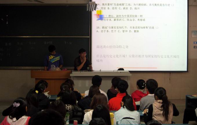 本次导游知识竞赛是以团小组为单位展开竞答,考题主要涉及全国导游基础知识、安徽导游基础知识,导游业务、旅游政策与法规等方面内容,共分为五个环节,每场活动历时约2个半小时。活动以“你问我答”开始,其他环节循序渐进,其中“全体抢答”环节更是将比赛推向高潮,在紧张激烈的竞赛过程中,经过精心准备的选手们都充分展示了各自的特色,他们冷静机智、应对自如,充分展示了自己学习的热情与风采。最后,比赛在激动人心的颁奖中落下帷幕。