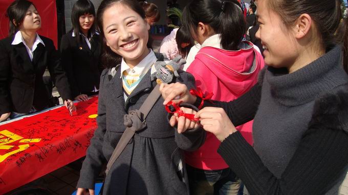 活动以“心怀感恩,情系两会”为主题,并借感恩节为契机,通过签名的方式让同学们写下感恩、学会感恩,铭记肩上的时代使命和责任。现场,组织者通过向同学们宣传学校团代会和学代会的相关知识和向签名同学系上红丝带等形式让每一位同学感受“两会”气息和营造感恩氛围,活动中,到场的学校相关部门领导和女同做爱