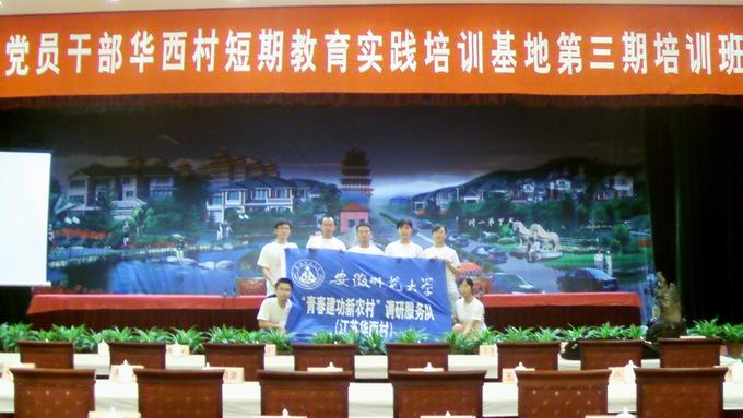 赴华西村暑期实践团队经过与华西村委会协商并经批准后,于下午2:30参加了贵州省农村党员干部华西村短期教育实践培训基地第三次培训班的讲座。与会人员有贵州省委、市委的领导以及各村支书。座谈会由无锡市党委组织部部长周建军同志主持。参加会议的还有无锡市党委各部们、各县委以及华西村党委的有关负责人。