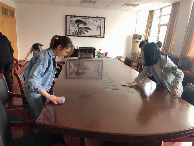 行政楼清扫三楼及四楼会议室。同学们扫地、拖地、擦门、擦桌椅、整理桌椅布局……分工合作,井井有条。清洁干净整洁后的会议室焕然一新,为下午考研复试的学长学姐们营造一个更好的面试环境。雷锋言行一致、公而忘私、艰苦奋斗、助人为乐,同学们在平凡而重要的劳动中学习雷锋精神,传承并践行助人为乐的中华民族优良品质。