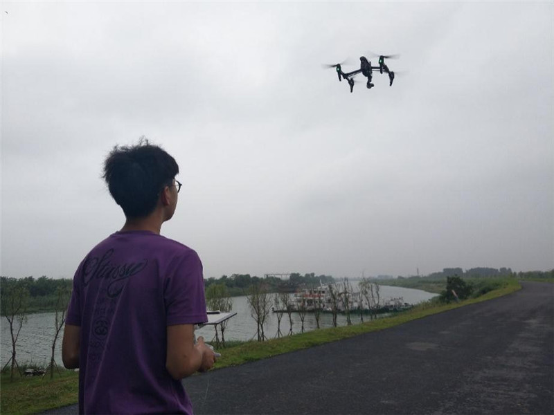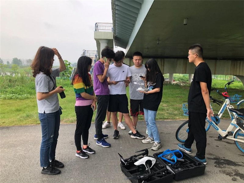 一旦天气允许,队长徐文翔便会把无人机牢牢绑上车,笑称:“这可是我们调研的大将呢! 把我自己弄丢也不能让它有什么损伤。”到达每个水样采集点,队员们便会小心翼翼的把无人机组装好,按照室内预计好的方法和路线对采样点以及沿途河段进行航拍。从来没有试飞过的队员们也在一旁学习经验。