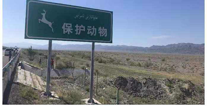 一个又一个“保护动物”的公路标志牌不时映入我们的眼帘。麻金继教授告诉我们,这是为提醒来往的车辆注意避让迁移的天山马鹿而建的。我们发现,在每一个“保护动物”标志牌附近都有一个路下动物通道。