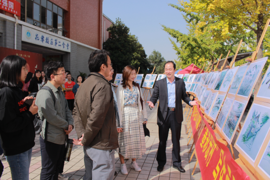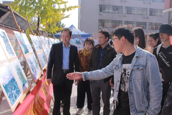 领导及老师们来到现场,同学们热情地围上去给老师们讲解自己的作品,宏村写生的带队老师鲍涛也从专业的角度向领导老师们讲解每幅画的风格和亮点。面对一幅幅精彩的画作,乔静、杨兴柱对同学们赞不绝口。