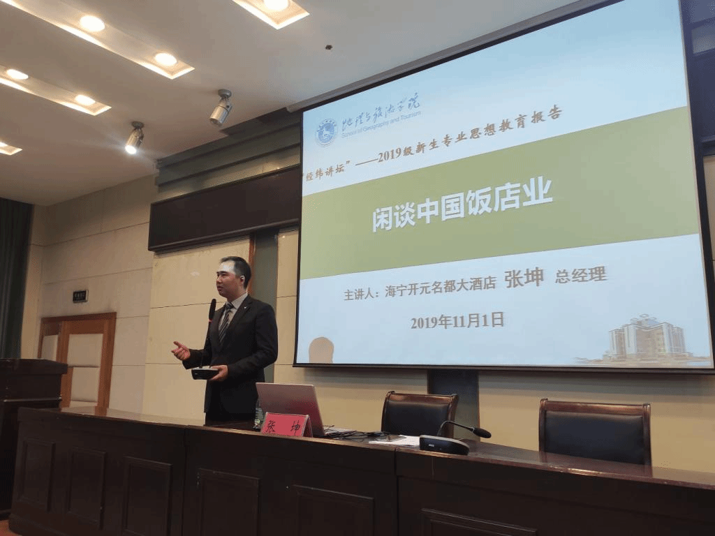 2019级旅游管理类专业举办“经纬讲坛”—2019级新生专业思想教育报告:旅游饭店业的发展及现状专题报告。2004届旅游管理专业优秀校友张坤(现任海宁开元名都大酒店总经理)重返母校,就旅游饭店业的发展及现状,为2019级旅游管理类专业学弟学妹们上了生动而精彩的一课。