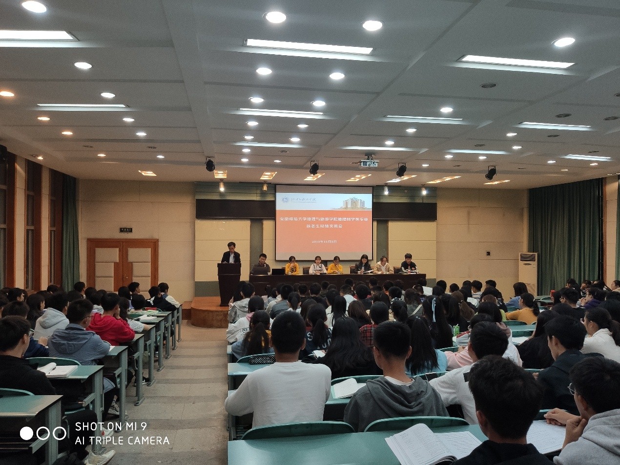 实验楼101报告厅召开新老生经验交流会。2018级地理科学大类专业杨帆、程茜、陈健、冯安兰、章皓宇、汪岩、张良敏等7名优秀老生代表,2019级地理科学(拔尖人才班)、2019级地理科学类1班、2019级地理科学类2班全体同学参加交流会。会议由辅导员齐小学主持。