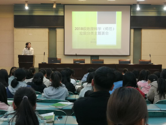 本网讯(王阳 罗文菁)为了倡导学生实行垃圾分类,2018级地理科学师范班11月19日晚于实验楼101报告厅召开关于“垃圾分类,从我做起”主题班会。会议由辅导员王阳主持,2018级地理师范班全体成员参加。