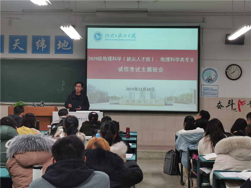 高诗涵 齐小学)12月18日晚,2019级地理科学大类在行知楼2040104、2040501教室召开诚信考试主题班会,2019级地理科学(拔尖人才班)、2019级地理科学类专业全体同学参加班会。班会由辅导员齐小学主持。