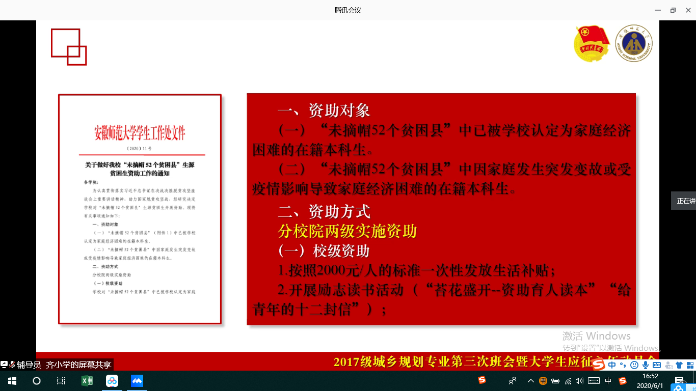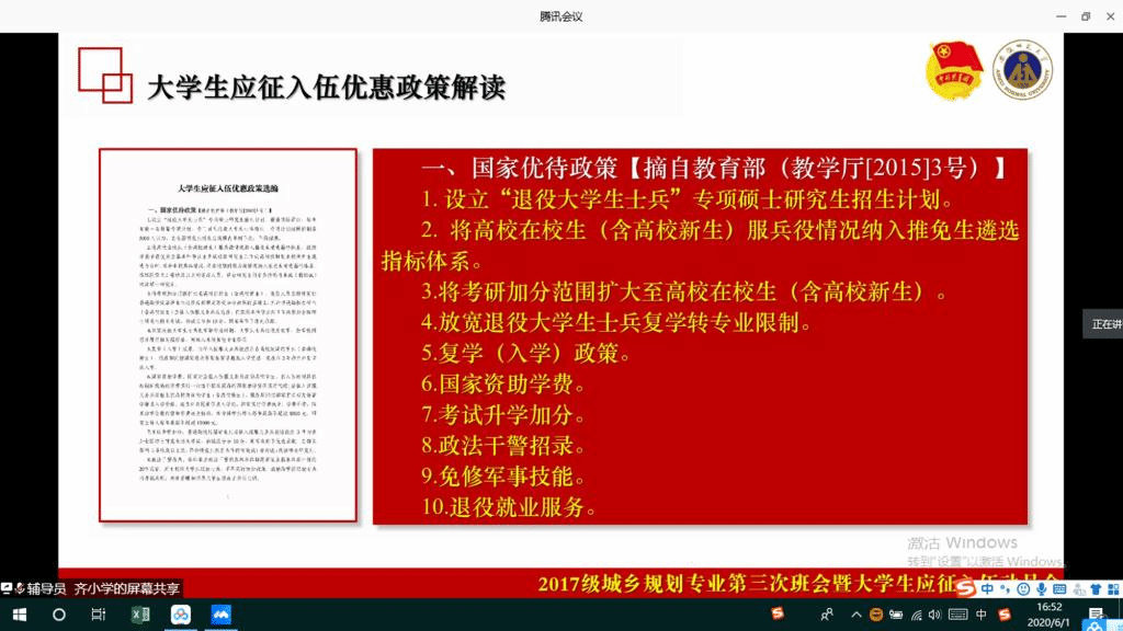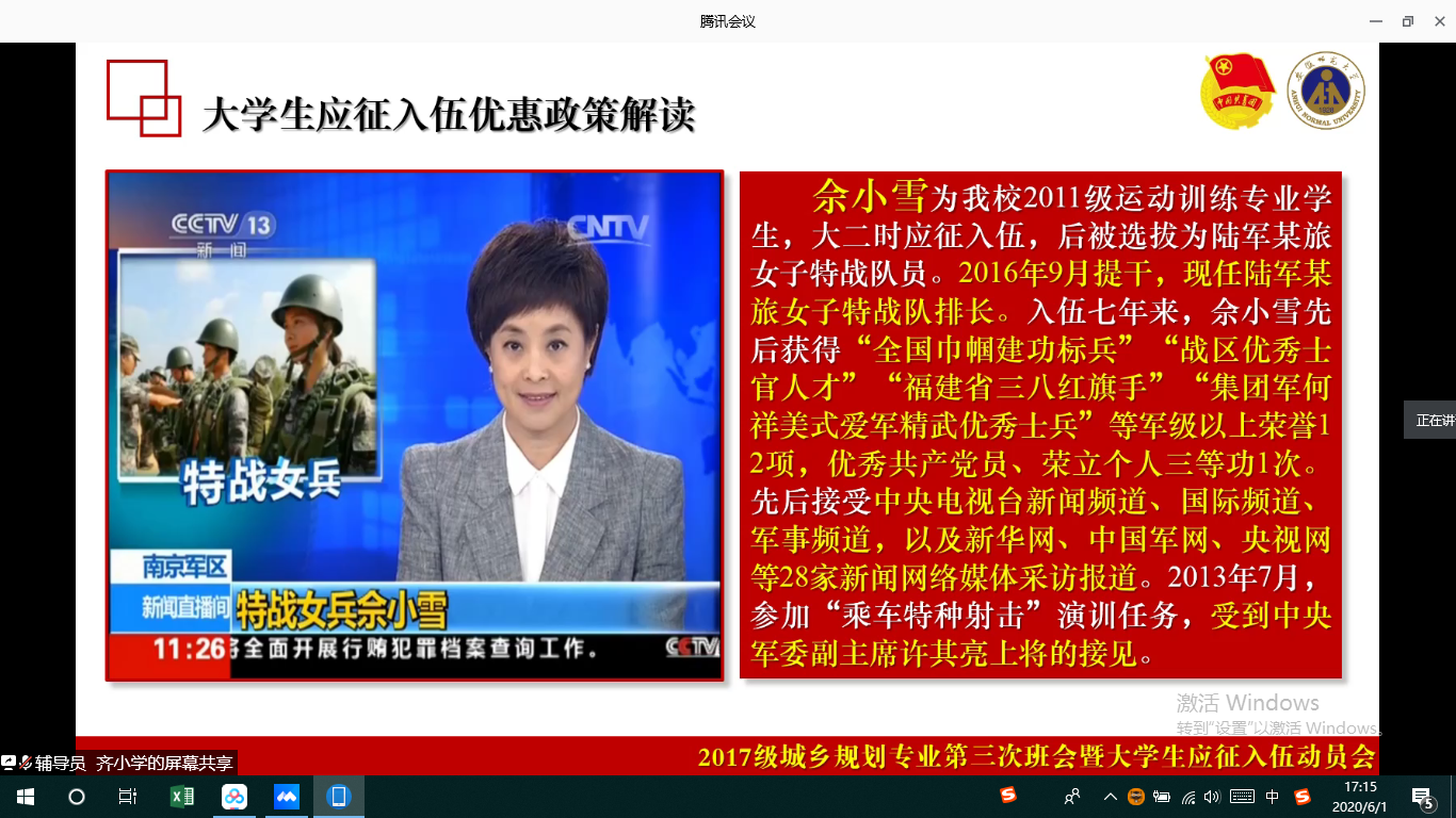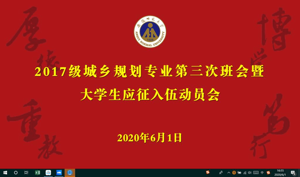 张鑫 齐小学)6月1日下午,2017级城乡规划专业在腾讯会议举行2019-2020学年第二学期第三次班会暨大学生应征入伍动员会,班级全体同学参加会议。会议由辅导员齐小学主持。