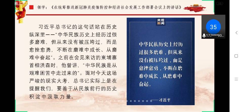 会议开始,团支书吴浩泽带领与会人员集体学习2月23日习近平总书记在统筹推进新冠肺炎疫情防控和经济社会发展工作部署会议上的讲话,详细说明了党和国家为疫情防控稳定大局的各项措施;他说,作为新时代青年大学生,应当增强必胜之心、责任之心、仁爱之心、谨慎之心、勇当先锋、敢打头阵、主动担当、积极作为。