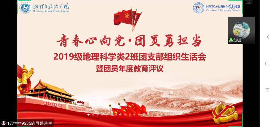 武诺 齐小学)为加强爱国主义教育,增强团支部凝聚力、组织力、战斗力。4月22日晚上,2019级地理科学类2班在腾讯会议上召开了“青春心向党,团员勇担当”主题团支部组织生活会暨团员年度教育评议。辅导员齐小学、院团委委员夏梦妮出席会议,2019级地理科学类2班全体学生参加会议。会议由组织委员戴铖主持会议。