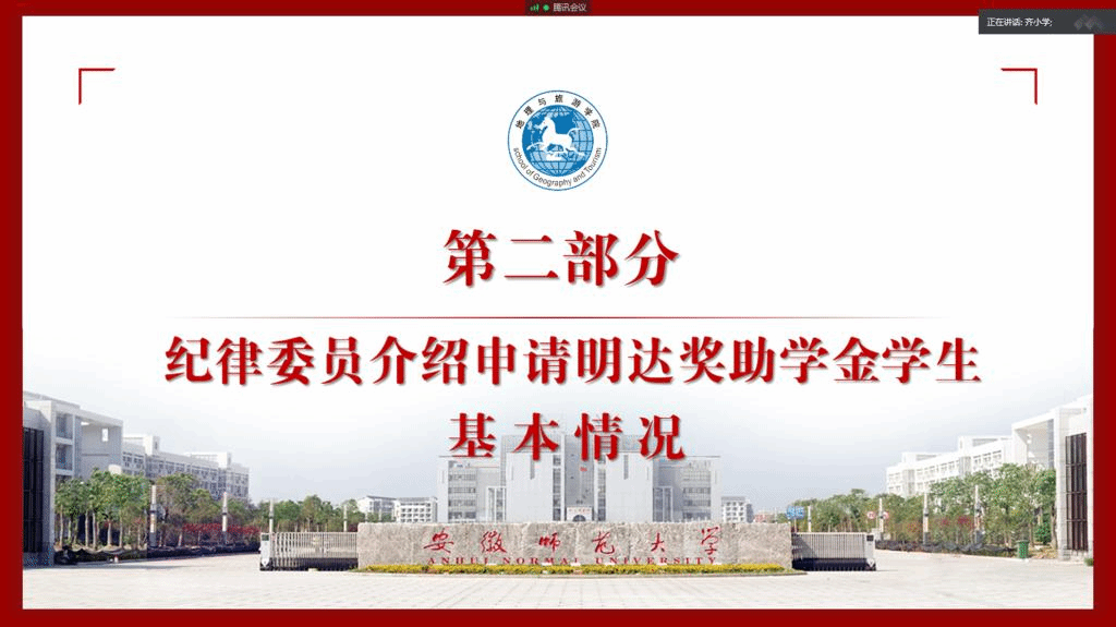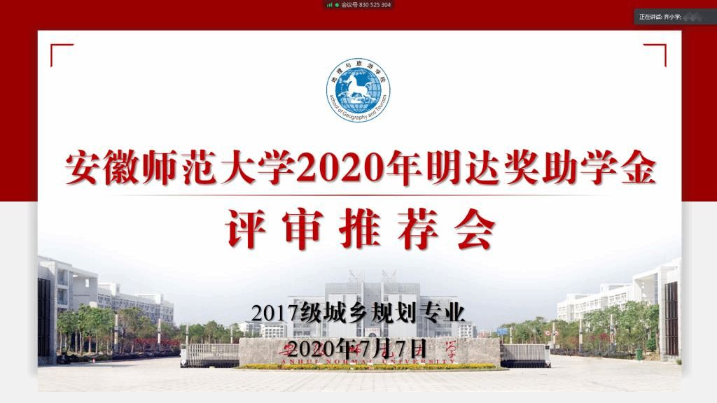 齐小学)7月7日下午,2017级城乡规划专业利用腾讯会议网络平台顺利召开明达奖助学金评审推荐会,班级评议小组全体成员参加会议。会议由评议小组组长、辅导员齐小学主持。