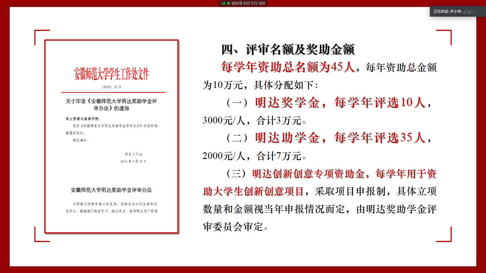 会议共分为四个部分。首先,齐小学就带领评议小组全体成员认真学习了《安徽师范大学明达奖助学金评审办法》。他强调,明达奖助学金是深圳明达资产管理有限公司为积极支持教育事业的发展,资助在读本科生顺利完成学业,激励其勤奋学习、励志成才而在安徽师范大学设立的社会奖助学金。自2016年设立以来以成功评选过4届,共资助了140名学生。对此,在评选过程中一定要严格标准、公平公正、认真细致,推选出最佳人选供评审委员会审核、确认,切实发挥出明达奖助学金资助育人、培优助困的积极作用。