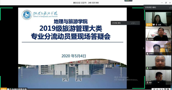 2019级旅游管理类专业老师们于2020年5月4日晚19时通过腾讯会议召开了线上专业分流动员会暨现场答疑会,为同学们专业分流进行指导。