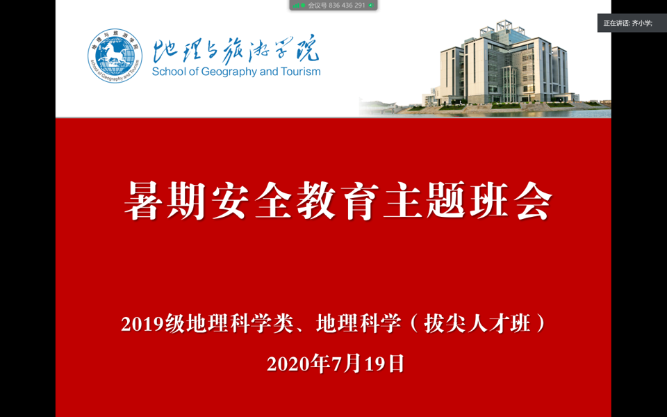 武诺 齐小学)在新冠肺炎疫情防控常态化、当前洪涝灾害多发频发的特殊背景下和大学生暑期社会实践全面启动之际,7月19日晚,2019级地理科学大类通过腾讯会议平台召开暑期安全教育主题班会。2019级地理科学类1班、2班和地理科学(拔尖人才班)全体同学参加会议,会议由辅导员齐小学主持。