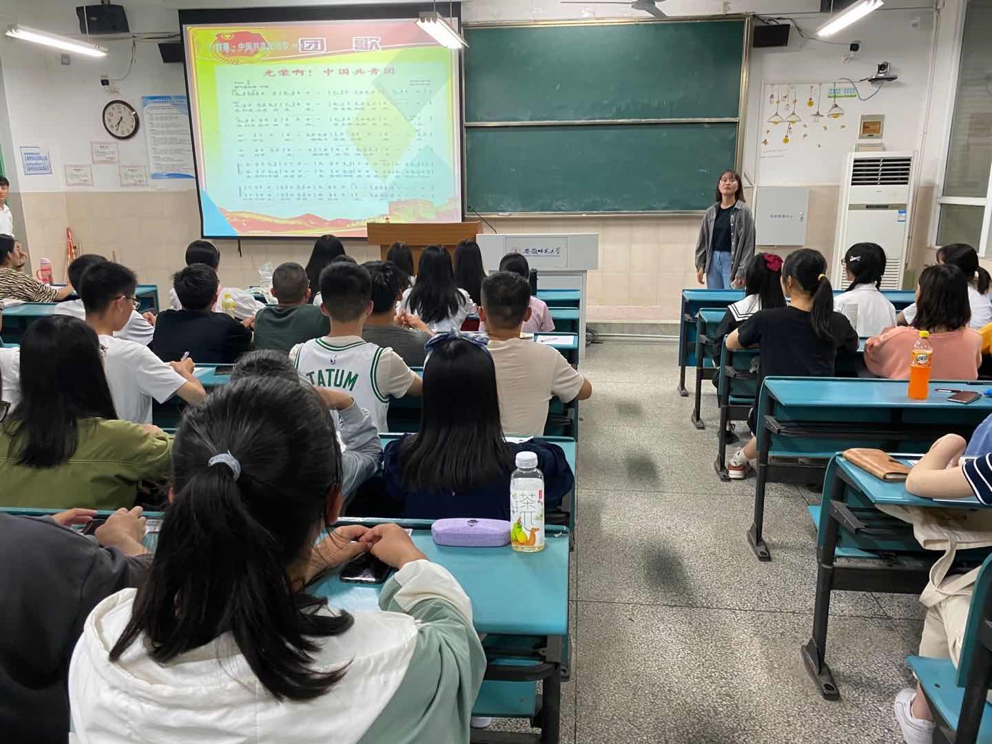 青春充满激情和梦想,“我们是五月的花海,用青春拥抱时代;我们是初升的太阳,用生命点燃未来。”同学们积极参与团歌教唱活动,我班团支部书记徐雨菲同学带领大家学唱团歌,活动现场气氛活跃。