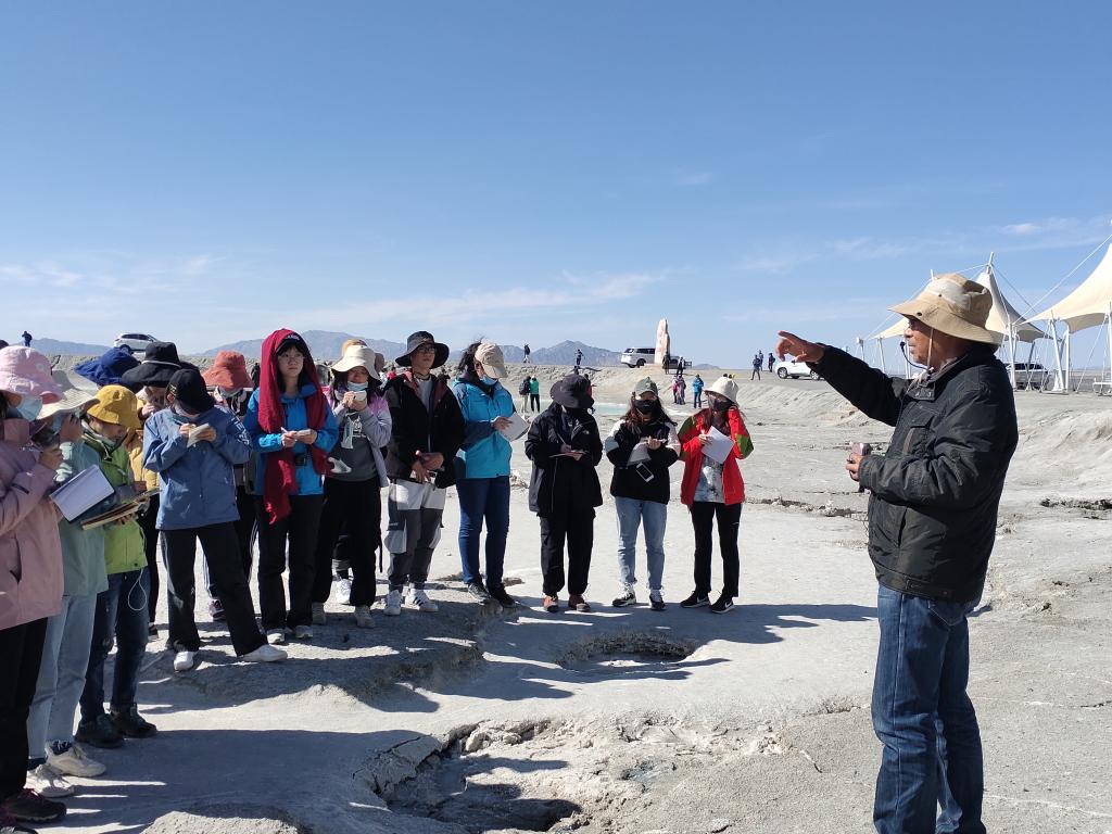 10月15日下午2时30分,团队全体成员在带队老师的带领下顺利抵达目的地——有“人间仙境”之美誉的大柴旦翡翠湖。程先富首先给同学们讲解了柴旦的含义,他指出柴旦在蒙古语中是盐湖的意思。在接下来的讲解中,同学们又了解到翡翠湖原是矿坑,位于大柴旦盐湖内部,湖水中钾、钠、镁、钙等矿物质含量较高,对阳光的散射作用使得湖水呈现翠绿色,形似翡翠,故而得名翡翠湖,又随着阳光照射角度及水深的变化,造成了湖水颜色的多变。随后程先富从地形地貌、物质来源、气候变化、河流补给四个方面向同学们阐述了盐湖在此形成的原因,并解释了此地因祁连山洪积扇扇缘地下水出露地表而形成淡水出水孔。在程先富的指导下,同学们对于翡翠湖的特征及成因有了明确的认识,意识到要严格按照水文点的考察研究方法观测盐湖湖水的相关数据特征,并及时进行样本采集。