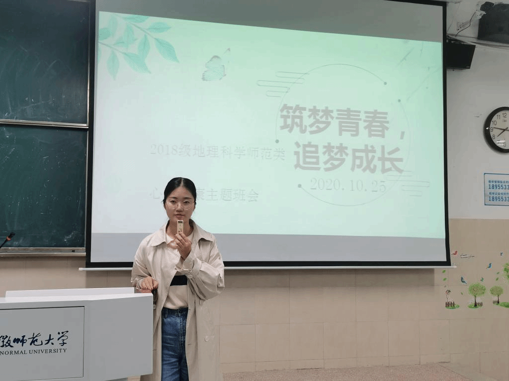 首先班级的心理健康委员陈冬阳以“筑梦青春,追梦成长”为主题,以名人对于“青春”的观点引入班会,再结合各高校发生的大学生心理健康问题案例,给出了大学生心理出现健康问题的几点原因,同时给出了对应的建议,给予同学们心灵上极大的安慰与帮助。之后辅导员丁茹栩又为同学们进一步补充了相关知识,并结合事例希望同学们可以重视自身的心理健康,在遇到困难时主动向学校、学院、老师、寝室长或心理委员寻求帮助。此次主题班会中,辅导员也为同学们近期可能遇到的问题进行解答并给出自身建议,同时给予了同学们真切的祝福。