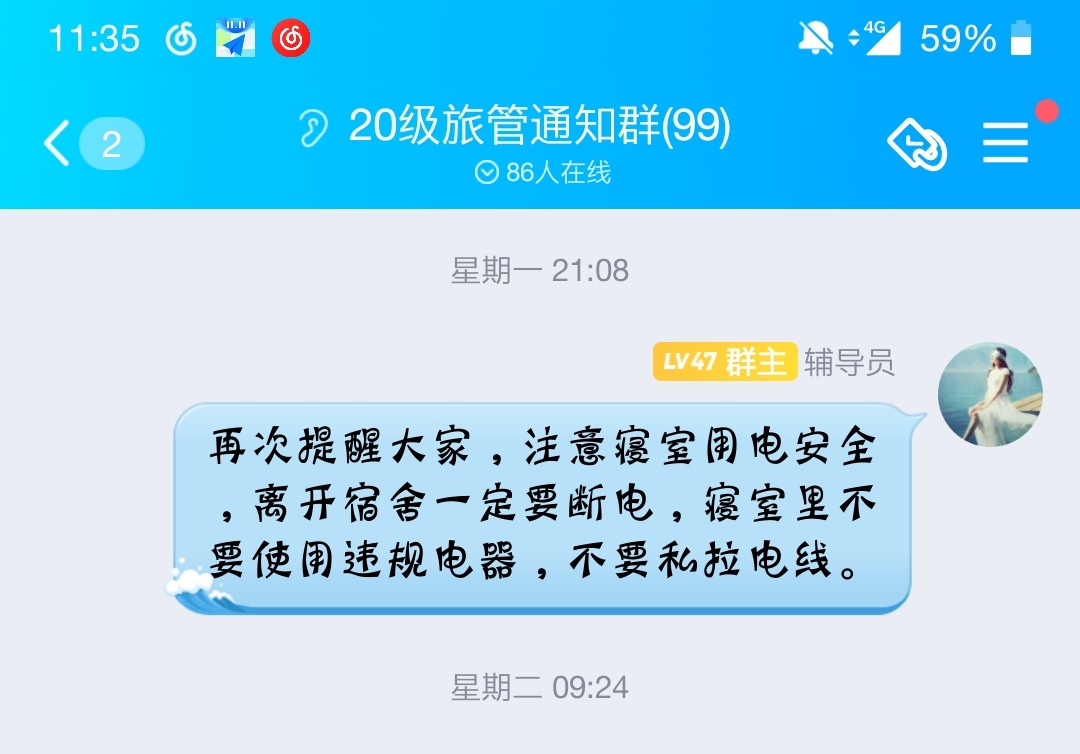 积极落实“零点”汇报制度,各年级各专业以班级为单位,寝室长为监督负责人,每晚23:00辅导员通过“今日校园”了解学生在寝情况,及时掌握学生晚归不归或等情况。为切实加强20级旅游管理专业学生就业安全教育,赵佳慧通过事务性班会、QQ群通知等提醒大家注意冬季寝室用电防火安全及寝室卫生。女同做爱