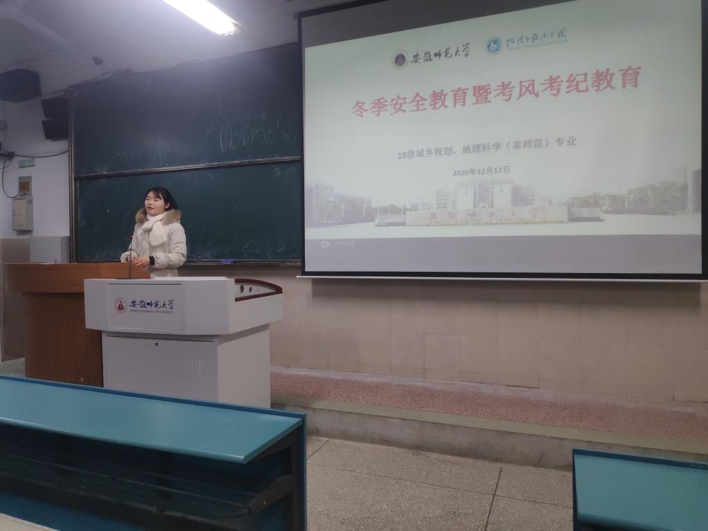 李娜 张慧)强安全防范意识,营诚信考试氛围。2020年12月17日晚上七点,2018级地理科学(非师范)、2018级城乡规划专业冬季安全教育暨考风考纪教育主题班会在行知楼4号楼104教室顺利举行。班会由辅导员张慧主持。