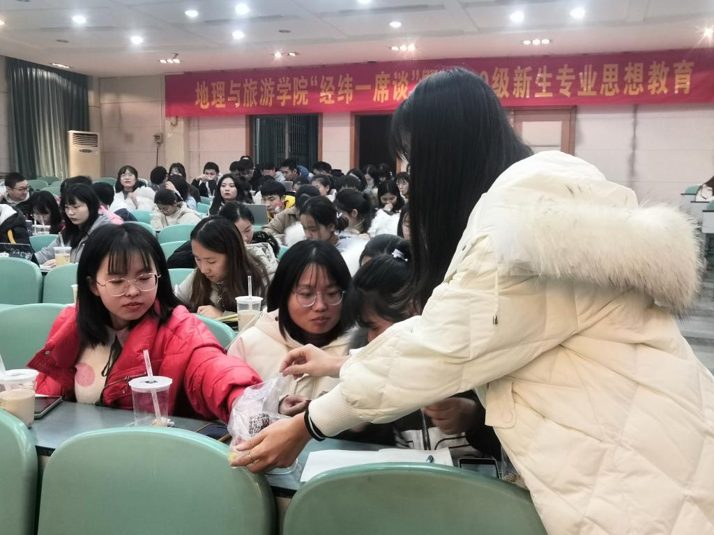 丁茹栩 罗文菁)万象更新迎牛年,齐心协力谱新篇。2020年12月27日晚上七点半,2018级地理科学(师范)专业“除旧岁,迎新年”跨年分享会在地旅实验楼101报告厅顺利举行。班会由辅导员丁茹栩主持。