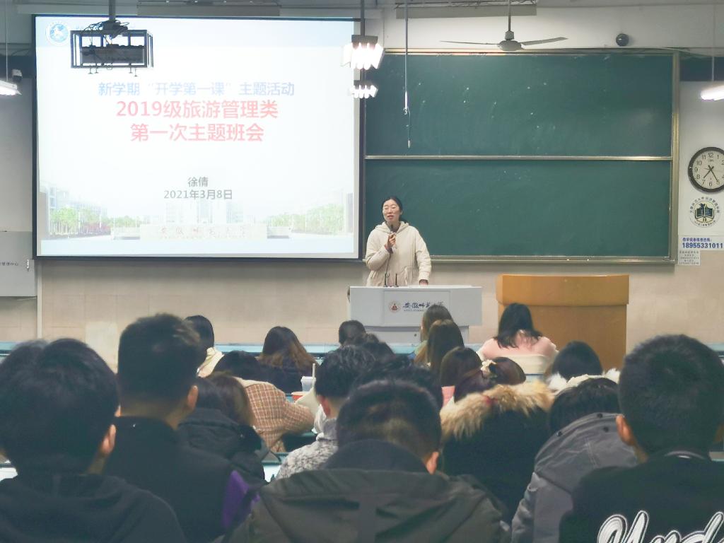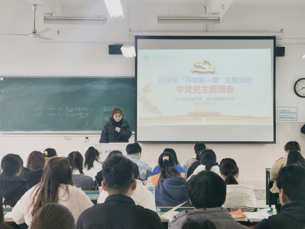 3月12日下午3:35至4:15,19级旅管大类同学组织开展了“开学第一课”系列活动——“学好一堂思政课”。两专业团支书宋雨霏和程杨同学在行知楼教室主持开展了学党史主题班会,对同学们进行建党100周年党史及爱国主义宣传教育。