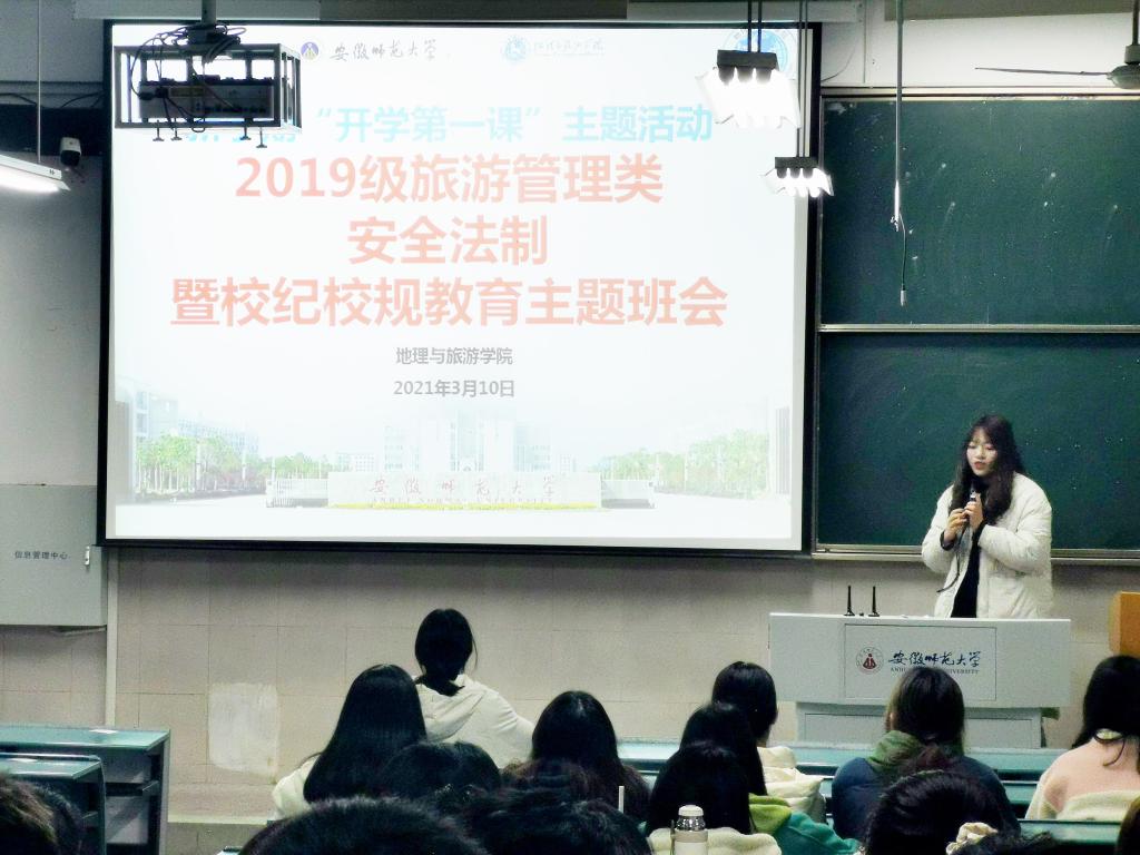 3月10日晚7:30至8:00,19级旅管大类同学还组织开展了“开学第一节课”系列活动——“学好一堂法制课”及“学好一堂安全课”,19级旅管班学习委员鲍格格在行知楼教室主持开展了安全法制暨校纪校规教育主题班会,新学期再度严明校规校纪准则,加强规则和法治意识;加强校园安全、网络安全、财产安全、生命安全教育,与同学们共同勉励,相互监督,共同度过安全美好的校园生活。