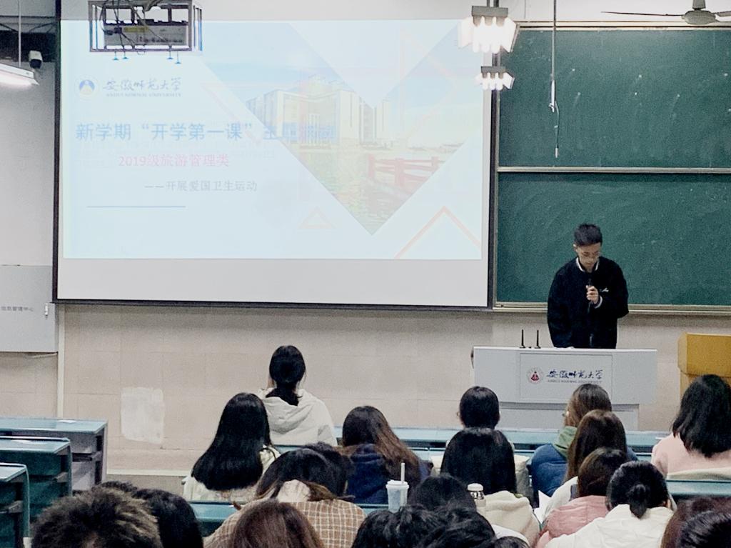 同日晚8:00至9:00,徐倩组织安排19级旅管大类同学开展“开学第一课”系列活动——“学好一堂劳动课”,同学们根据安排打扫了本班级固定教室及卫生负责区域。生活委员唐伟康带领同学们开展“爱国卫生运动”主题班会并切实响应芜湖市垃圾分类号召,鼓励对教室遗留下来的垃圾进行有效的分类处理。