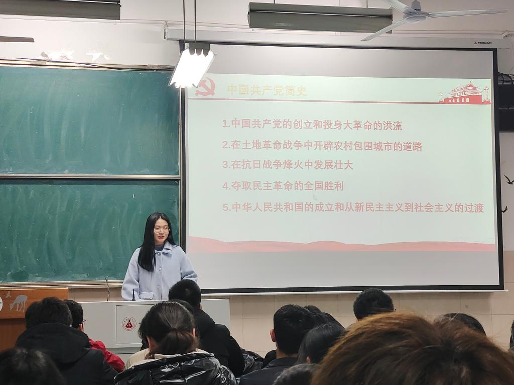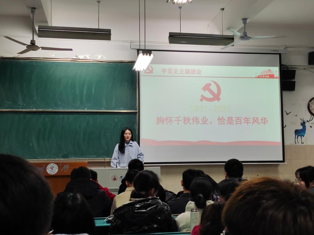 会议伊始,张曼其同学以一句“胸怀千秋伟业,恰是百年风华”口号带动大家热烈庆祝中国共产党即将成立100周年,同时也以此口号开启了对中国共产党党史的学习。她就中国共产党的成立背景和目的,中国共产党的建设道路以及所取得的成就一一带领大家学习和领悟,同学们通过张曼其同学对党史的解读,对党史的内容和理解也更加深刻。