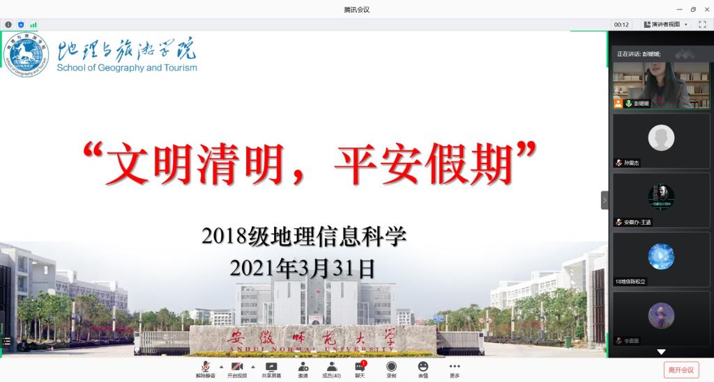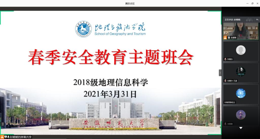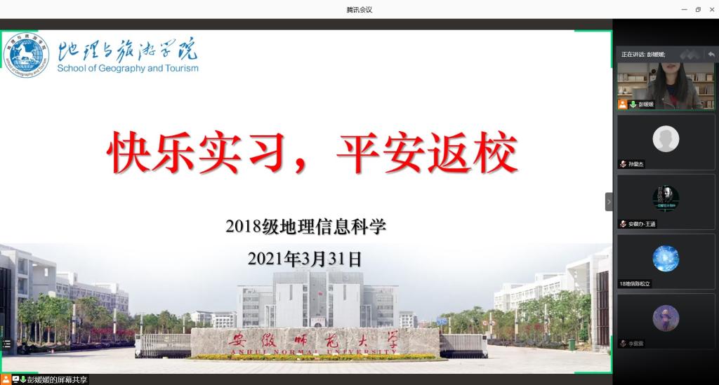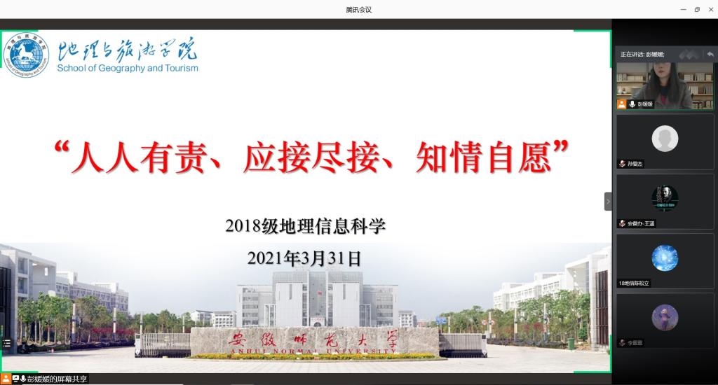 本网讯(孙雯杰 彭媛媛)实习生涯已进行一周,为加强同学们清明安全与实习安全思想教育,提醒接种疫苗相关事项,2018级地理信息科学专业于2021年3月31日晚上9:00在腾讯会议开展清明假期与实习安全暨接种疫苗政策宣讲线上主题班会。班会由辅导员彭媛媛主持,2018级地理信息科学专业全体同学参与。