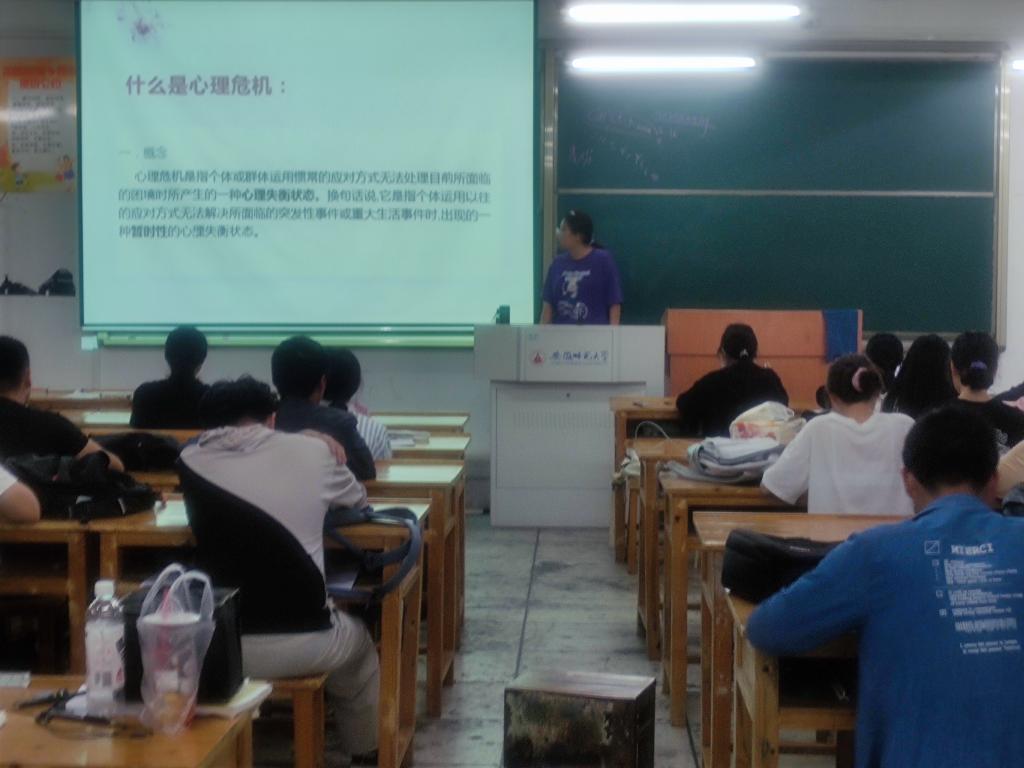 首先温雪歌向大家普及了什么是心理危机,出现心理危机时有哪些表现:包括心理的变化、情绪的变化以及行为的变化等;以及大学生现阶段常见心理危机:包括人际交往危机和学业危机等。然后,温雪歌向大家介绍了如何理性的应对心理危机:大学生在四年的成长过程中,难免有心理危机的困扰,危机与成长伴随大学生走过青 春岁月。我们碰到的大多数心理危机,都是可以通过自我调节或专业人士的帮助顺利度过的。比如将危机转换为动力、将危机看成是一场考试、将危机转化为提升心理素质的契机以及寻求社会支持等方法。接着,温雪歌同学引用作家冷莹的话笑着鼓励同学们说,“你可以躲起来疗伤,但不要躲得太久,你为旧伤口浪费的是你本可以用来幸福的时光。”